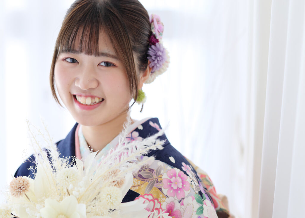 髪の毛の長さやヘアスタイルによって変わりますが、振袖のお嬢様で前撮り時は約1時間半、式典当日は約2時間お時間をいただいております。